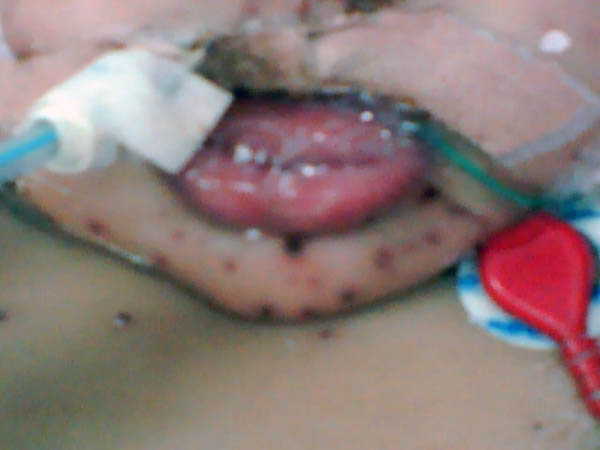 Extensive involvement of the mucous membrane of the mouth, tongue and pharynx may interfere with feeding and the child becomes debilitated and seriously ill .