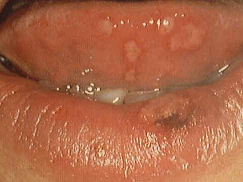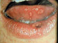 Oral lesions are also frequent, and take the form of erosions on the tongue, palate, gingiva and buccal mucosa.