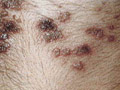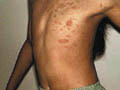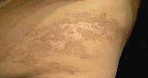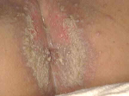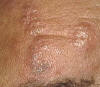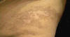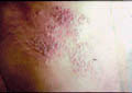Psoriasis. The lesions show silvery scaly patches. The scales covers the whole patch.