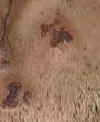 The lesions show shallow ulcers on an erythematous base covered with whitish exudate, which bleeds when removed.