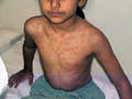 Blood tinged saliva in severe cases causes dribbling in young children.