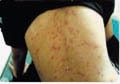 Profuse usually symmetrical, pruritic, dull red papules develop which become later purpuric. The sites involved are first on the thighs and buttocks, then on the extensor aspects of the arms and finally on the face. There may be jaundice in cases associated with hepatitis. The eruption usually fades within one month or less.